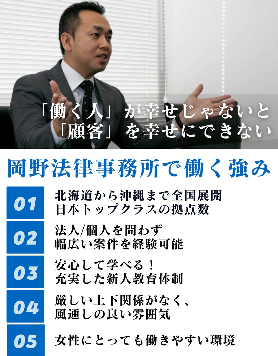 岡野法律事務所では、幅広い事件を取り扱っていますので、多種多様な事件を経験してみたい方、弁護士として成長したい方、弁護士としての経験値をあげたい方、支店を開設することに興味がある方にとって働きやすい職場であると思います。