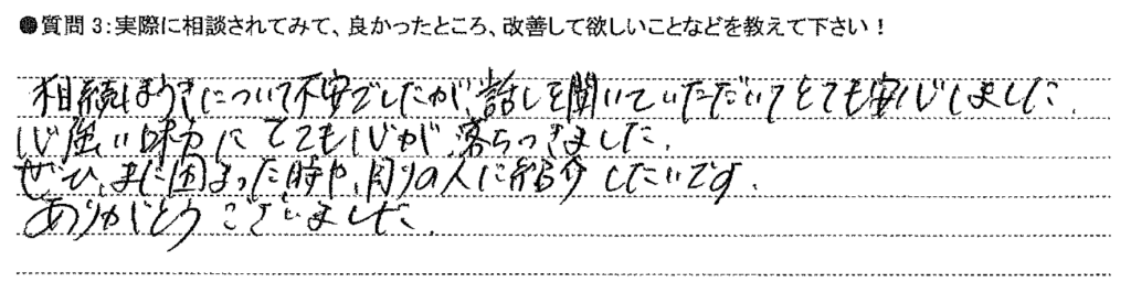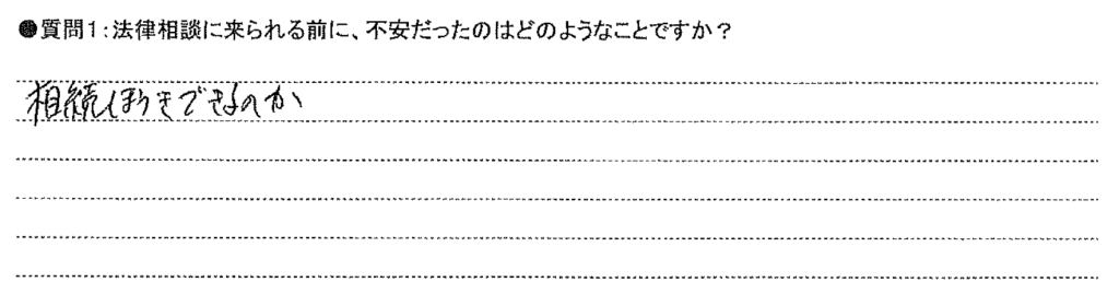 相続放棄について不安でしたが、話しを聞いていただいてとても安心しました。心強い味方にとても心が落ちつきました。ぜひ、また困った時や、周りの人に紹介したいです。ありがとうございました。