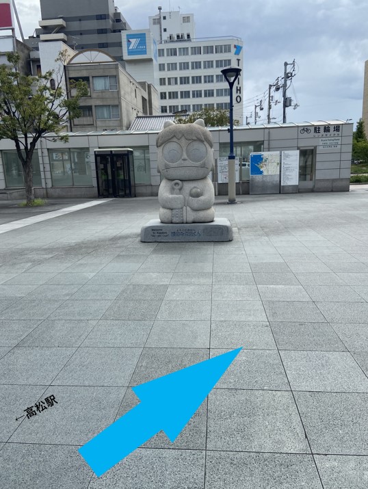 ③ 駐輪場があります。目印に青鬼くんの石像があります。