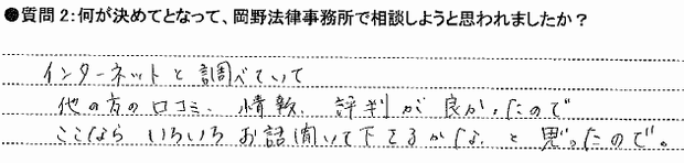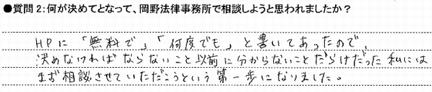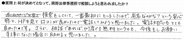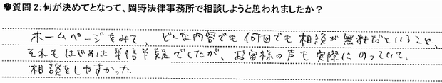 ホームページをみて、どんな内容でも何回でも相談が無料だということ、それもはじめは半信半疑でしたが、お客様の声も実際にのっていて、相談をしやすかった