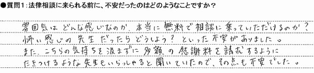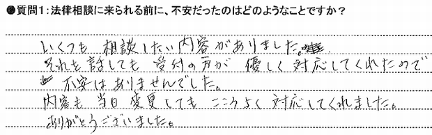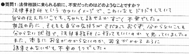 法律事務所というカタいイメージで、こわいなとドキドキしていて自分の伝えたいことも、ちゃんと話せるかすごく不安でした。