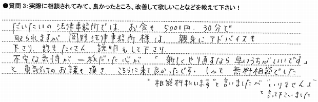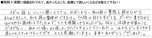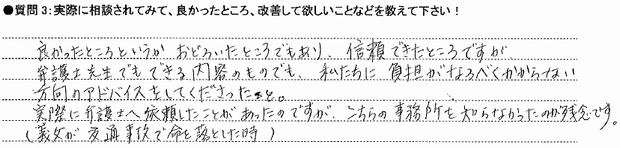 良かったところというかおどろいたところでもあり、信頼できたところですが、弁護士先生でもできる内容のものでも、私たちに負担がなるべくかからない方向のアドバイスをしてくださったと。