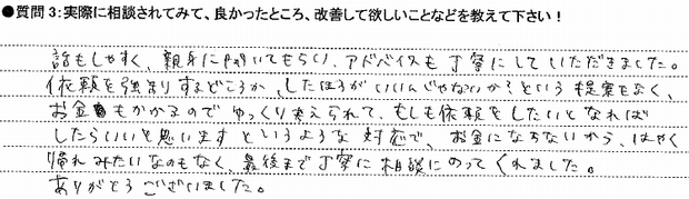 依頼を強制するどころか、したほうがいいんじゃないか?という提案もなく、お金もかかるのでゆっくり考えられて、もしも依頼をしたいとなればしたらいいと思いますというような対応で、お金にならないから、はやく帰れみたいなのもなく、最後まで丁寧に相談にのってくれました。