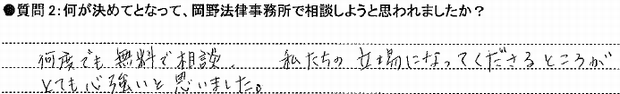 その点、岡野法律事務所ではすべて無料で電話の応対が優しく誠実で、この事務所なら間違いないと確信しました。