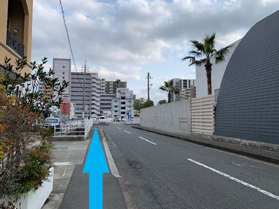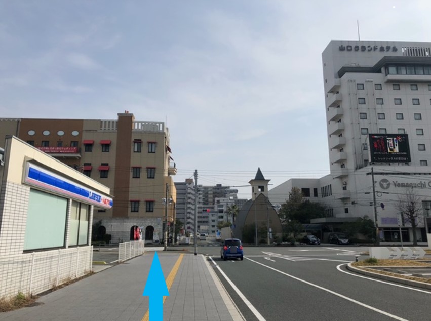 ④ 横断歩道を渡り、山口グランドホテルと結婚式場エミリアの間の道を直進します。
