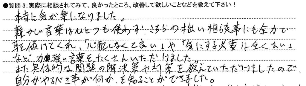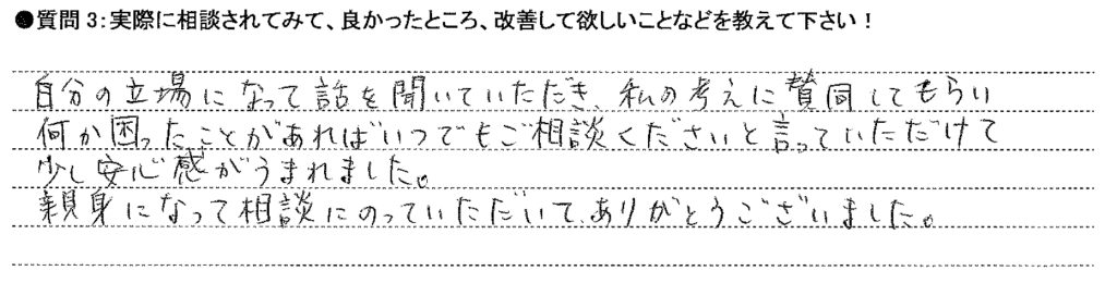 自分の立場になって話を聞いていただき、私の考えに賛同してもらい、何か困ったことがあればいつでもご相談くださいと言っていただけて少し安心感がうまれました。