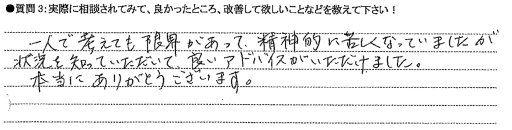 一人で考えても限界があって、精神的に苦しくなっていましたが、状況を知っていただいて、良いアドバイスがいただけました。本当にありがとうございます。