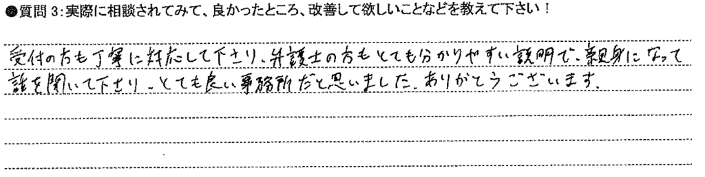 受付の方も丁寧に対応して下さり、弁護士の方もとても分かりやすい説明で親身になって話を聞いて下さり、とても良い事務所だと思いました。ありがとうございます。